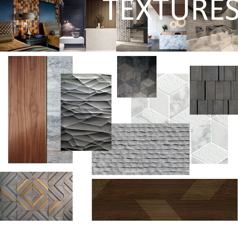 By using different textures you can create layers and warmth in a space. For example, you could use one material but mix it up by using that same material with different textures. Most people know that stone can be done in a polished and honed finish but did you know it can also come tumbled, leathered, scored/raked, split-faced, sandblasted and many more. You can not only create texture with stone but wood, metal, glass, and wallcoverings!